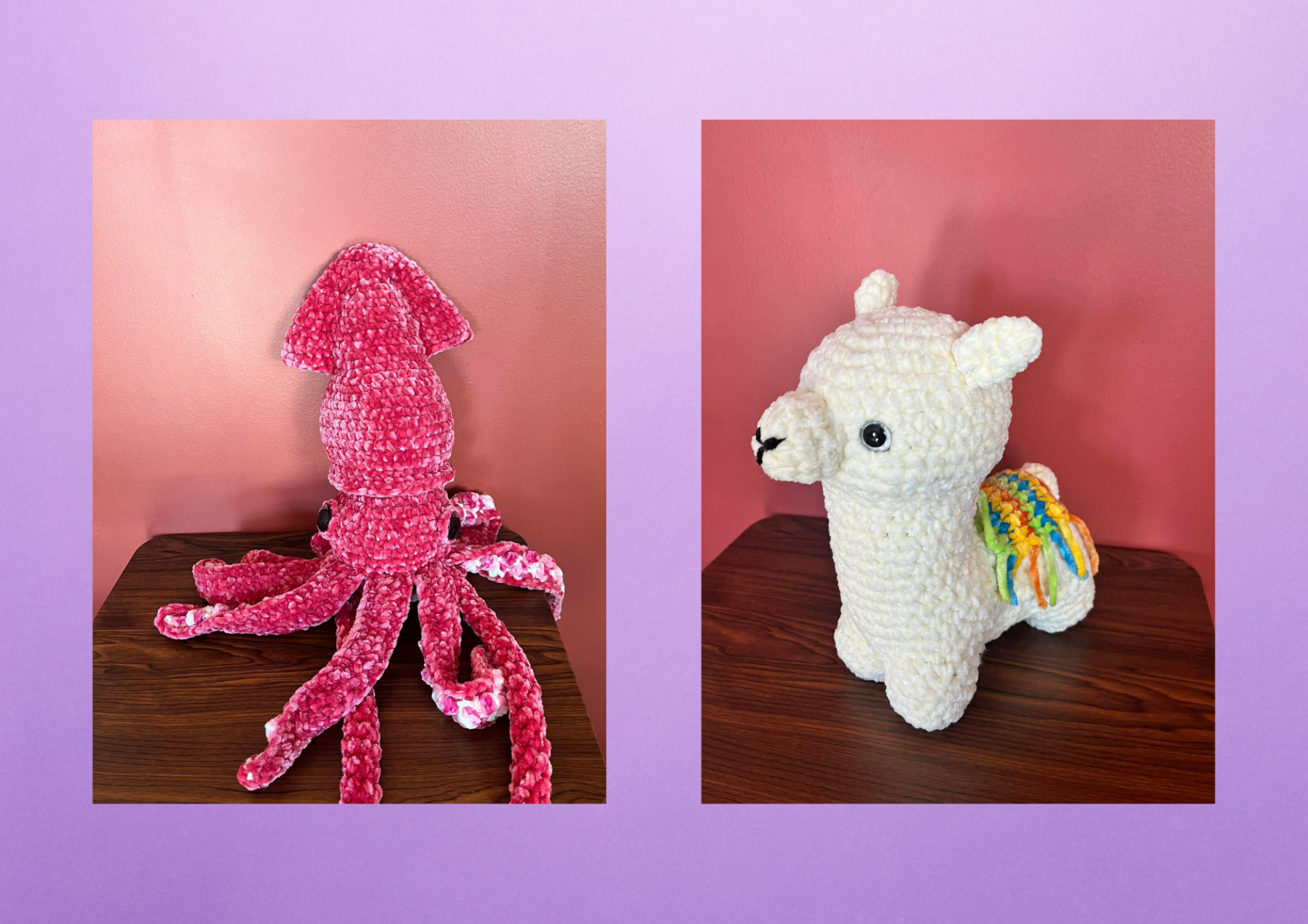 Ce mois-ci : le lama et le poulpe au crochet 🧶 🦙 Le lama au crochet Un adorable petit lama tout doux, réalisé à la main avec soin. Avec son allure tendre et son style bohème, il apporte une touche de fantaisie et de bonne humeur à ta décoration. Parfait pour une chambre d’enfant, un coin cocooning ou comme petit cadeau plein de charme. 🐙 Le poulpe au crochet Un petit poulpe craquant aux tentacules souples et amusants. Avec son look mignon et ses jolies formes arrondies, il séduit autant les enfants que les grands. Idéal comme objet décoratif, petit compagnon ou cadeau original fait main.